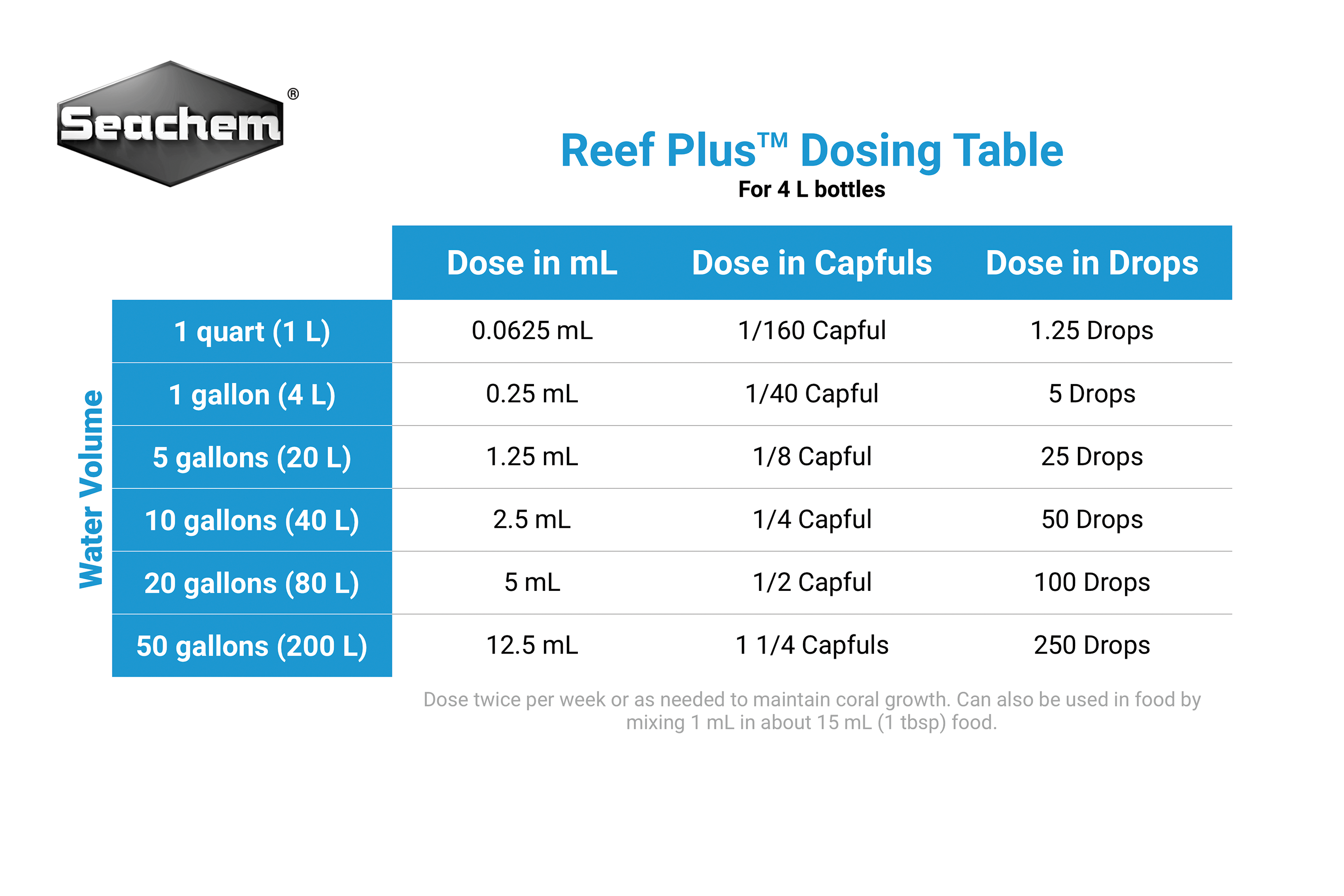 | Reef Plus™ Dose (mL) | 0.06 mL | 0.25 mL | 5 mL | 12.5 mL |