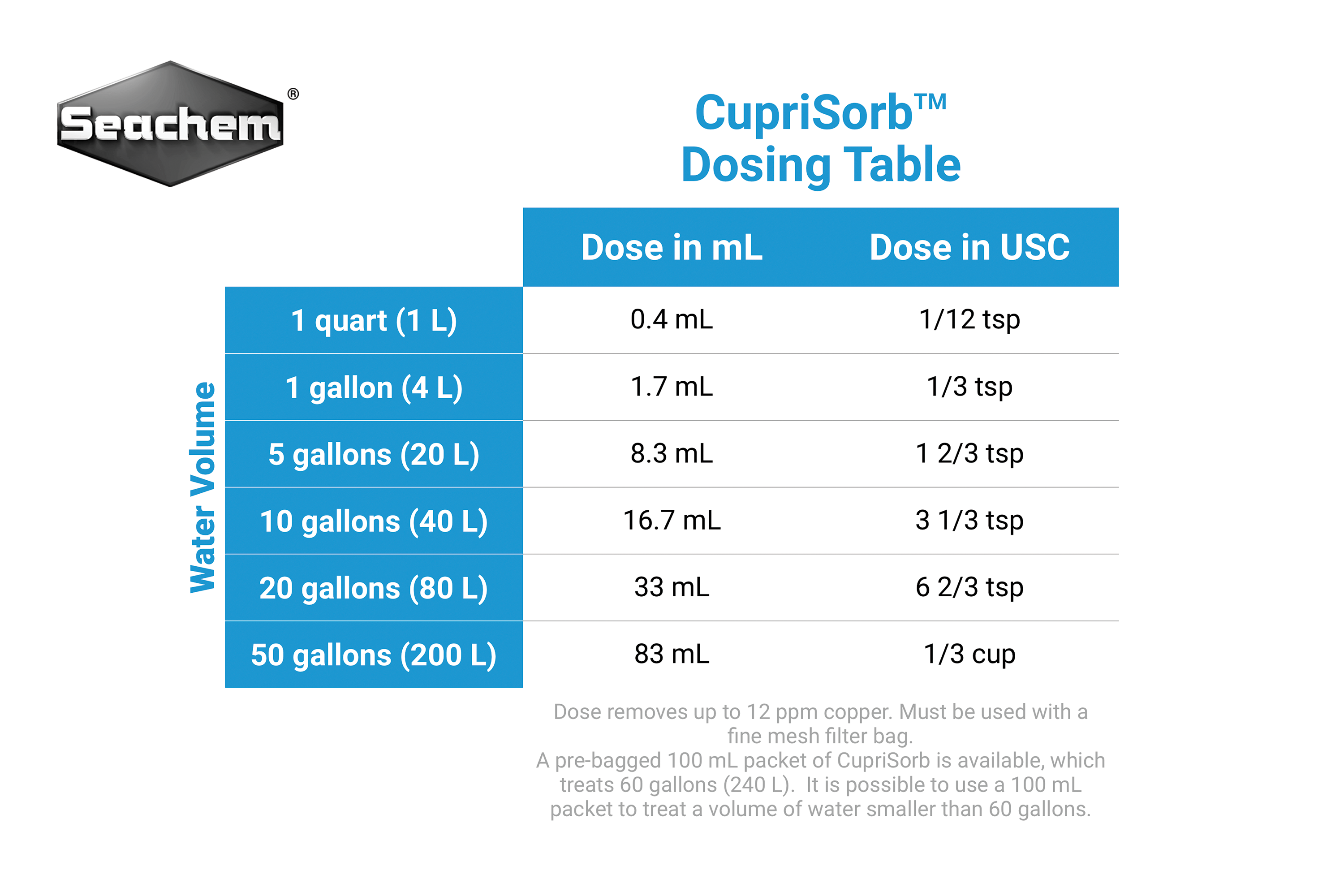 Like most Seachem® filter medias, CupriSorb™ is available in a convenient 100 mL pre-bagged packet which treats 60 gallons. For smaller tanks, it is recommended to dose according to the volume of the tank.